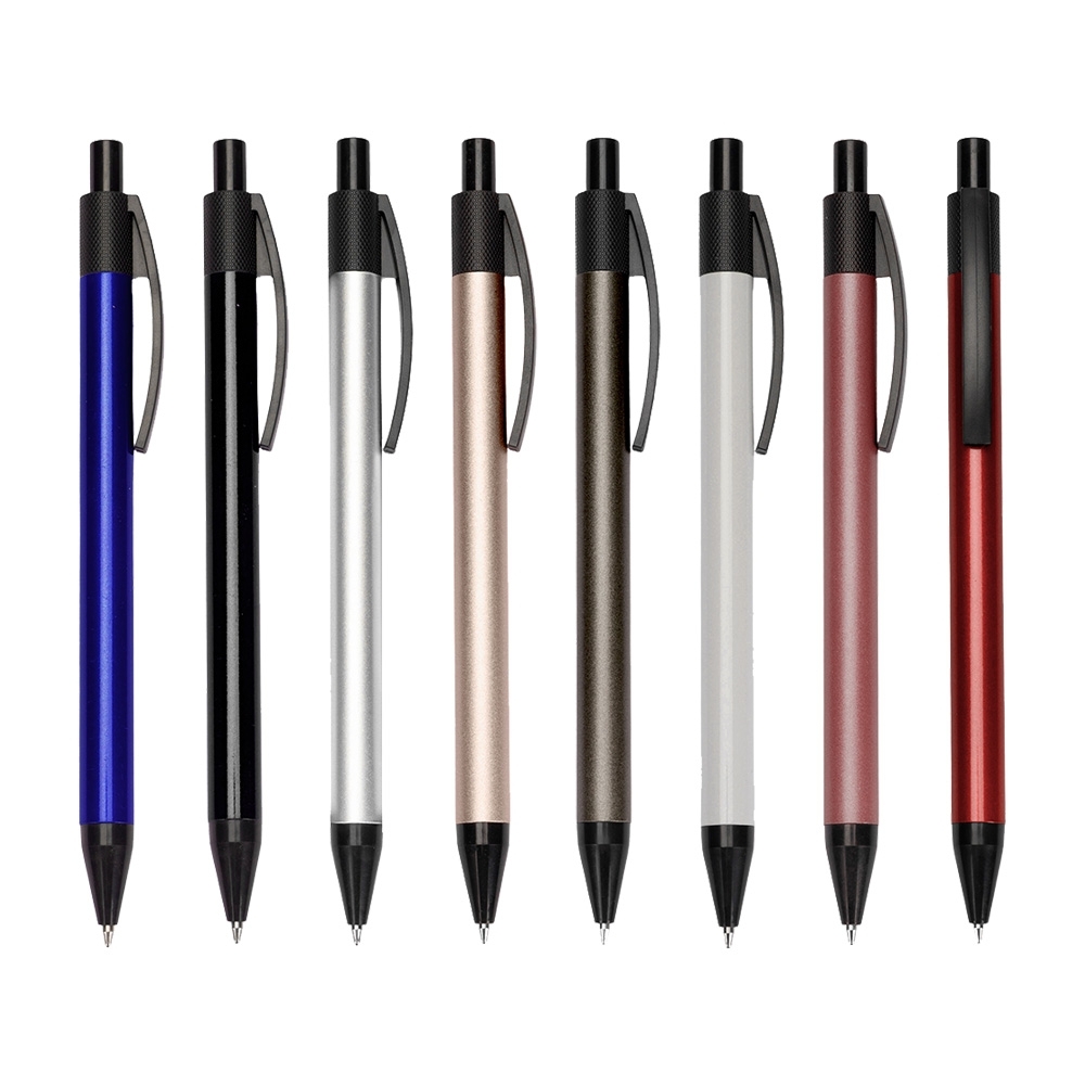 Caneta plástica com carga esferográfica azul 1.0mm, acionamento por clique.